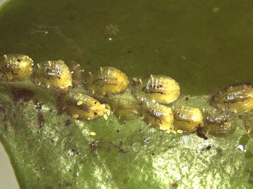 Descrição: É uma cochonilha desprovida de carapaça, de formato oval e de consistência mole. Mede cerca de 5mm de comprimento e é de coloração verde clara. Atacam ramos e a face inferior das folhas ao longo da sua nervura principal.